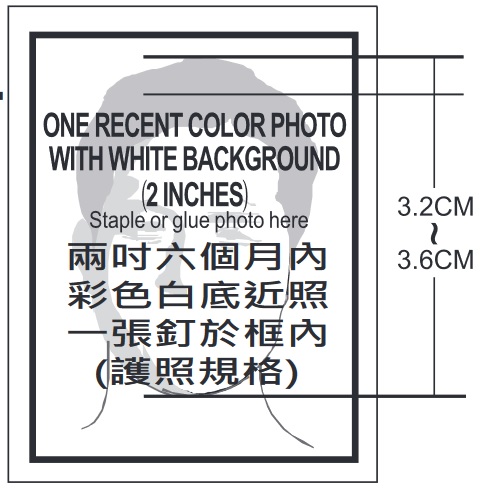 • Photo. One copy of 2 inch size photo (photo must have white background with a full face view of the person without wearing a hat or dark glasses and must be taken within 6 months)